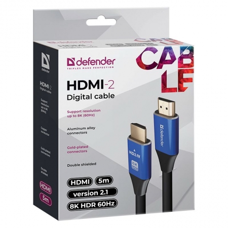 Производитель: Defender Наименование: HDMI-кабель Стандарт HDMI: 2.1 Поддерживаемые разрешения: до 8К при 60 Гц Разъемы: HDMI 19M-19M Материал проводника: Медь Особенности: Двойное экранирование, металлические коннекторы, позолоченные контакты Длина кабеля: 5 м Цвет: Чёрный/синий