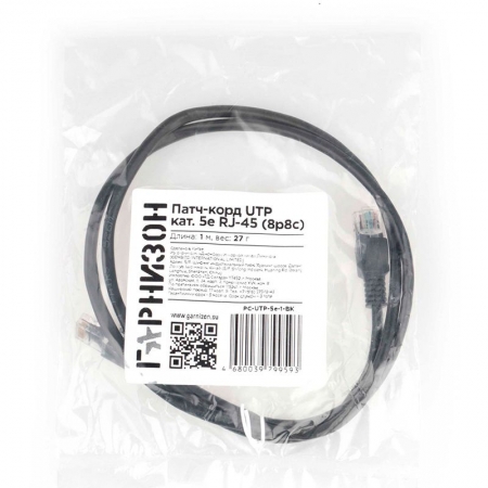 Кабель патч-корд UTP 5е категории 1 м, черный, CCA light, многожильный, Гарнизон (PC-UTP-5e-1-BK)