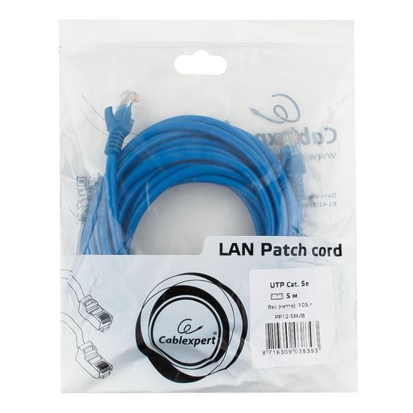 Производитель: Cablexpert Наименование: Кабель патч-корд UTP Тип кабеля: UTP, 4 пары Категория: 5е Разъемы: RJ-45 x 2 Материал проводника: Омеднённый алюминий (CCA) Контакты: позолоченные 50 микродюймов Диаметр проводника: 24AWG Материал оболочки: ПВХ Длина: 5 м Цвет: Синий