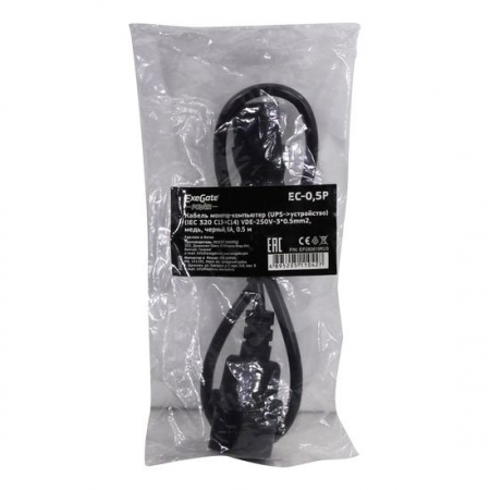 Кабель питания Exegate EC-0.5P предназначен для подключения монитора или ИБП к блоку питания компьютера, также может использоваться в качестве удлинителя для электрических шнуров, оканчивающихся разъёмом С13. Технические характеристики