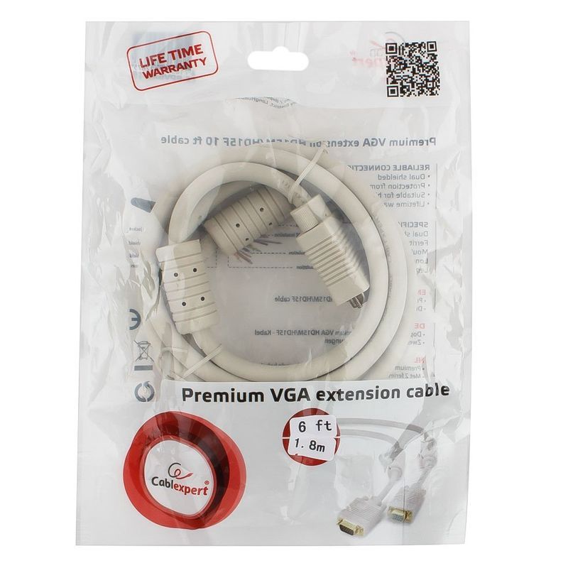 Кабель удлинитель Cablexpert Premium предназначен для подключения монитора/видеопроектора с интерфейсом VGA к видеокарте с аналогичным разъемом. Тройное экранирование и ферритовые фильтры обеспечивают передачу сигнала без помех. Особенности