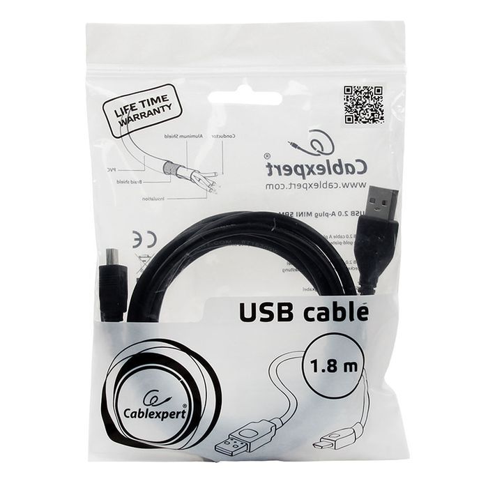 Производитель: Gembird Наименование: USB-кабель Интерфейс: USB 2.0 Пропускная способность: 480 Мбит/сек Разъемы: USB Am - mini Bm Контакты: Позолоченные 30 мкм Длина кабеля: 1.8 м Цвет: Черный
