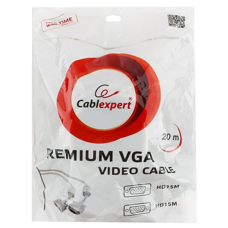 Кабель VGA 15M-15M, 20 м, серый, 2 фильтра, двойной экран, Cablexpert (CC-PPVGA-20M)