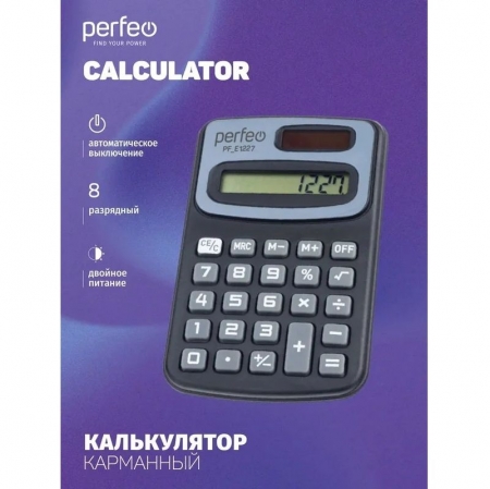 Калькулятор Perfeo PF_Е1227 будет Вам полезен в случаях, когда использование относительно громоздкого калькулятора неудобно или невозможно. В нем установлен 8-разрядный однострочный дисплей, информация с которого хорошо различима даже при ярком солнечном свете. Корпус очень компактен: его габаритные размеры составляют 100x64x8 мм. Вы сможете носить этот калькулятор даже в кармане. Оформление у данного устройства элегантное и понравится владельцам. У калькулятора двойное питание, которое он получает от устанавливаемой батарейки LR1130 или солнечного элемента. Такое совмещенное решение позволяет сэкономить заряд, увеличить автономность и пользоваться калькулятором в различных условиях. Среди функций: расчеты с процентами, сохранение значений в памяти, вычисление квадратного корня. Калькулятор простой, он рекомендован для рядовых пользователей, не нуждающихся в выполнении сложных вычислений.