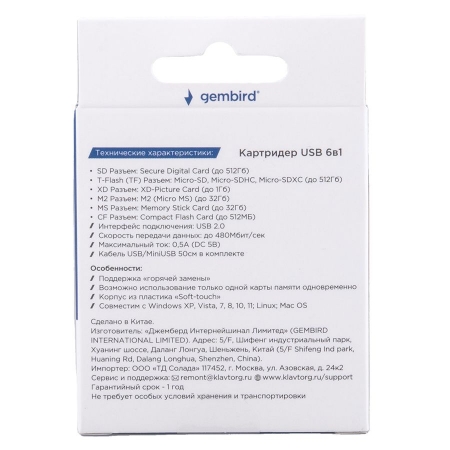 Мультиформатный картридер 6в1 Gembird FD2-MSD-4 предназначен для чтения/записи карт памяти SD, microSD, MS, M2, CF, xD. Поддерживает интерфейс USB 2.0, обеспечивающий скорость передачи данных до 480 Мбит/сек. Для установки не требуются дополнительные драйвера. В комплекте кабель USB/MiniUSB длиной 50 см. Технические характеристики