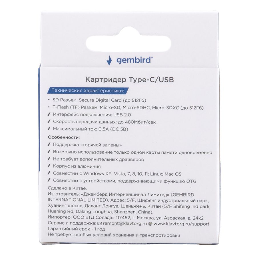 Производитель: Gembird Наименование: Внешний картридер Поддержка карт памяти: MicroSD, MicroSDHC, MicroSDXC; SD (до 512 Гб) Интерфейс: USB 2.0 Скорость передачи данных: до 480 Мбит/сек Разъемы: USB A, USB C Поддержка OTG: Да Материал корпуса: Алюминий