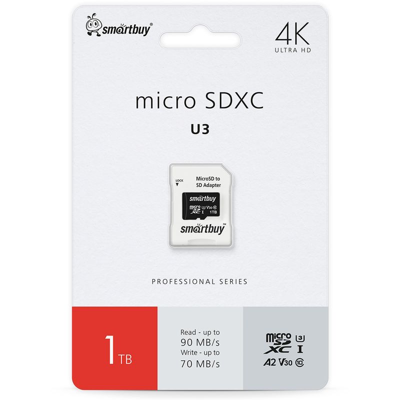 Карта памяти microSDXC Smartbuy Professional - универсальный носитель информации на основе технологии флеш-памяти для наиболее требовательных пользователей. Карта памяти предназначена для использования в цифровых фотоаппаратах, видеокамерах, телефонах, коммуникаторах, персональных компьютерах и других электронных устройствах, где требуется высокая скорость передачи данных и высокая надежность. Она имеет класс скорости Class 10 и соответствует стандартам UHS Speed Class 3 (U3) и V30, что позволяет записывать видео в формате 4K Ultra HD, обеспечивая скорости чтения и записи до 90 и 70 МБ/с, соответственно. В комплект входит адаптер SD. Данная карта может использоваться только в устройствах с поддержкой SDXC.