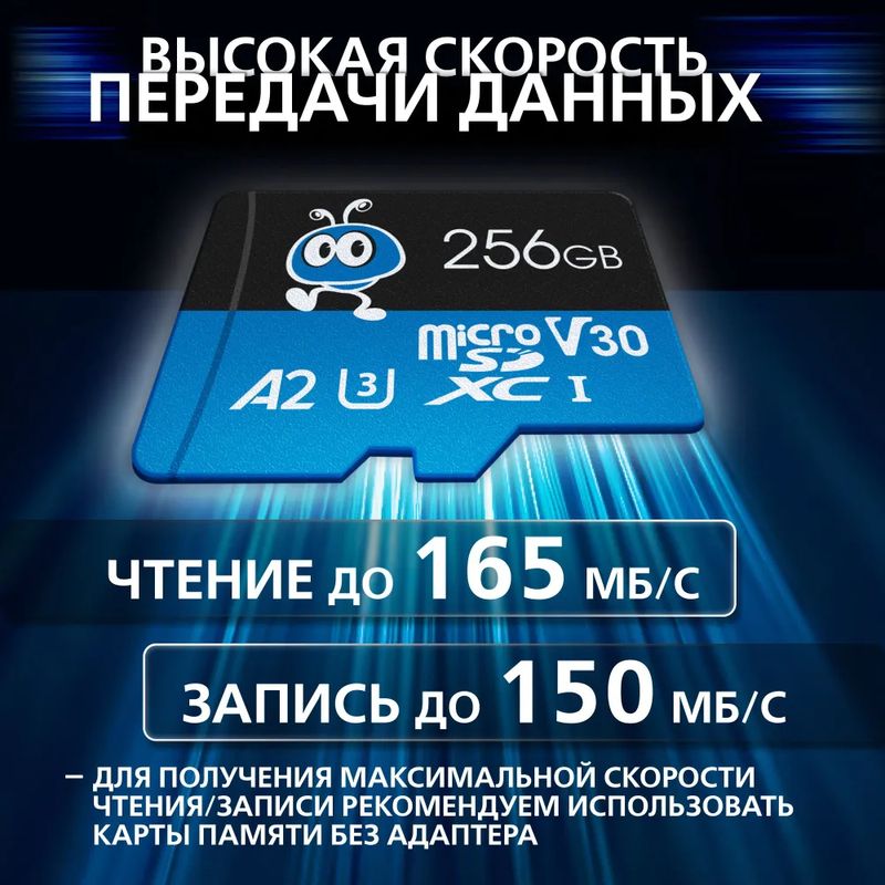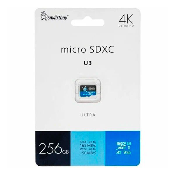 Micro SDXC Smartbuy Ultra - универсальный носитель информации на основе технологии флэш-памяти для наиболее требовательных пользователей. Карта памяти micro SDXC Smartbuy может использоваться в цифровых фотоаппаратах, видеокамерах, телефонах, коммуникаторах, персональных компьютерах и других электронных устройствах. Она поддерживает классы скорости Class 10, UHS-I U3, V30 и A2 и обладает высокой скоростью передачи данных (чтение до 165 Мб/с, запись до 150 Мб/с).