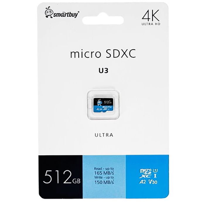 Карта памяти micro SDXC Smartbuy Ultra - универсальный носитель информации на основе технологии флеш-памяти для наиболее требовательных пользователей. Карта памяти предназначена для использования в цифровых фотоаппаратах, видеокамерах, телефонах, коммуникаторах, персональных компьютерах и других электронных устройствах, где требуется высокая скорость передачи данных и высокая надежность. Она поддерживает стандарты Class 10, UHS-I U3, V30, A2 и обладает скоростью чтения до 165 и записи до 155 МБ/с.