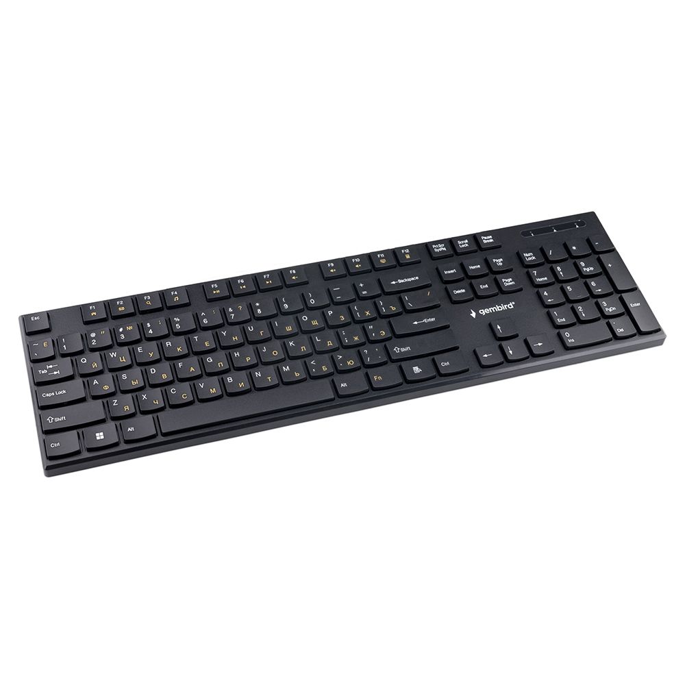 Gembird KBW-250 - полноразмерная мультимедийная беспроводная клавиатура. Модель выполнена в тонком корпусе и оснащена клавишами островного типа, которые отличаются низким ходом и пониженным уровнем шума. Также в клавиатуре имеются 12 дополнительных кнопок (Fn) для мультимедийными функциями. USB-ресивер подключается к USB-порту компьютера и не требует установки драйверов.