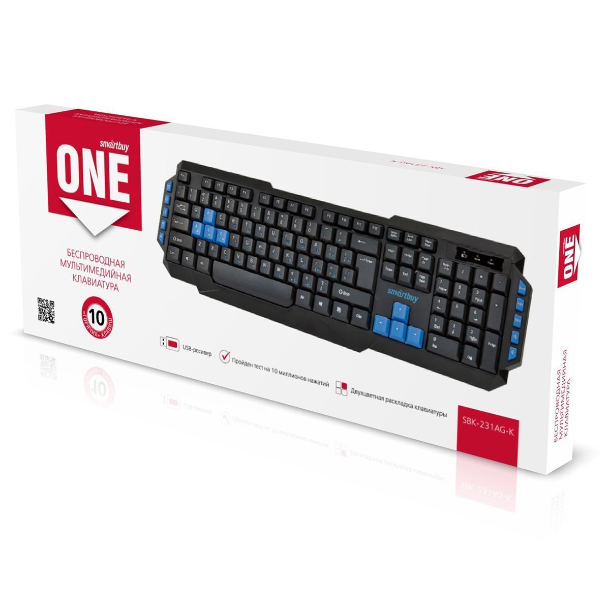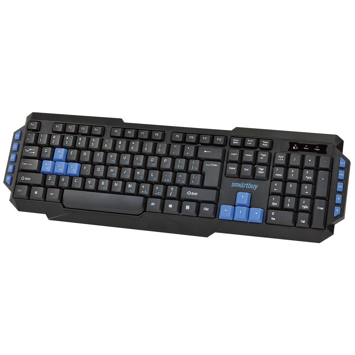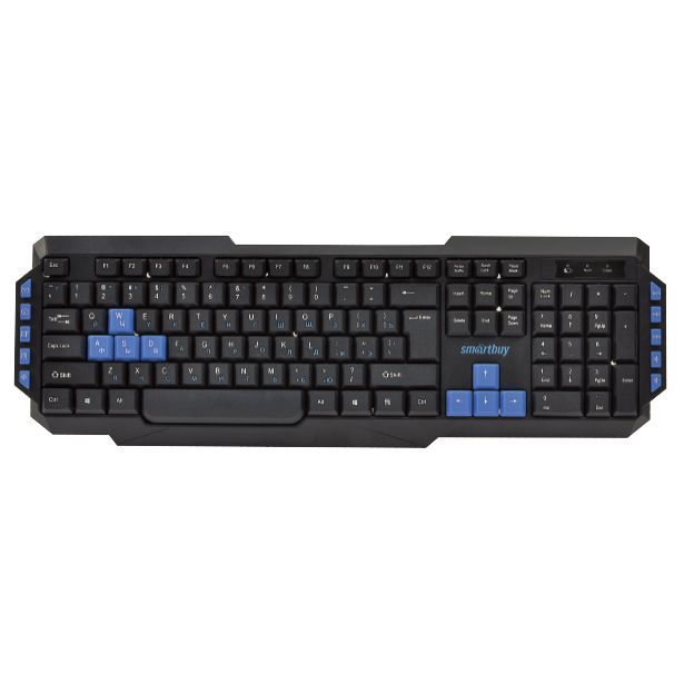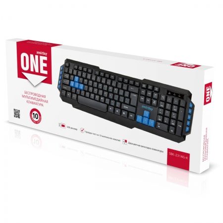 SmartBuy 231 - беспроводная мультимедийная клавиатура. Модель имеет полноразмерную раскладку и 10 мультимедийных клавиш для быстрого доступа к функциям проигрывателя и интернет-приложениям. Мультимедийные кнопки и основные игровые клавиши выделены синим цветом. Питается устройство от одной батарейки размера AA, которая входят в комплект поставки. Индикатор низкого заряда подскажет, когда необходимо заменить батарейку. USB-ресивер подключается к USB-порту компьютера и не требует установки драйверов. Технические характеристики