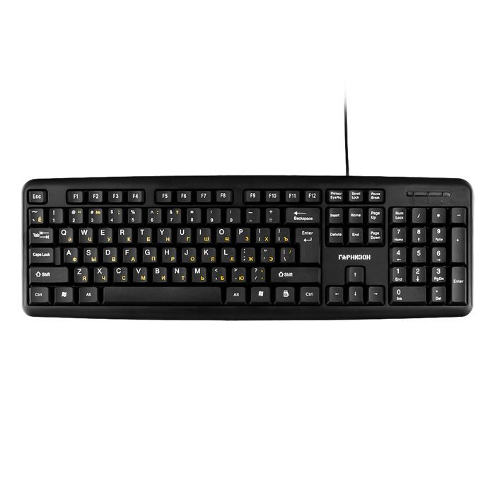 Производитель: Гарнизон Наименование: Проводная клавиатура Кол- во клавиш: 104 Цвет раскладки: Белый/желтый Угол наклона: Регулируемый Интерфейс: USB Длина кабеля: 1.5 м Материал корпуса: Пластик Цвет: Черный
