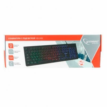 Gembird KB-240L - проводная клавиатура с радужной подсветкой. Клавиатура оснащена полноразмерной раскладкой и круглыми низкопрофильными клавишами островного типа. Регулируемый угол наклона способствует естественному положению рук во время работы. Устройство подключается к USB-порту компьютера и не требует установки драйверов. Технические характеристики