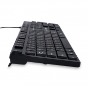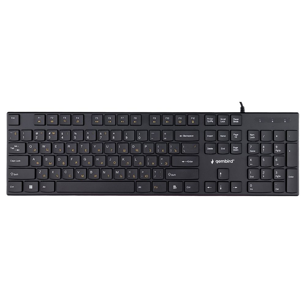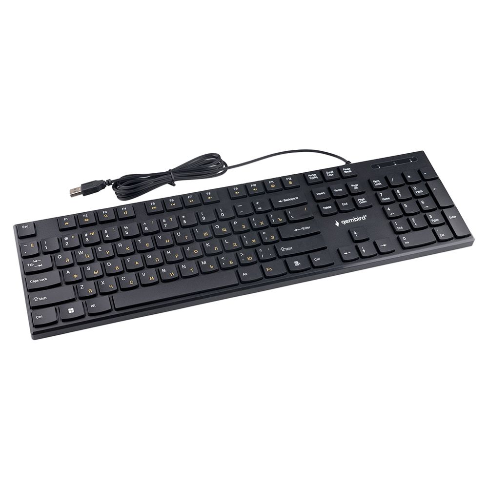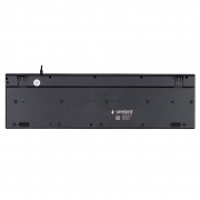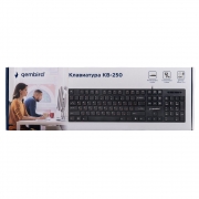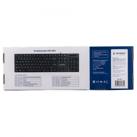 Gembird KB-250 - полноразмерная мультимедийная проводная клавиатура. Модель выполнена в тонком корпусе и оснащена клавишами островного типа, которые отличаются низким ходом и пониженным уровнем шума. Также в клавиатуре имеются 12 дополнительных кнопок (Fn) для управления громкостью и проигрывателем. Клавиатура подключается к USB-порту компьютера и не требует установки драйверов. Технические характеристики