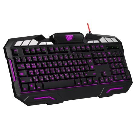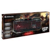 Defender Keeper GK-100DL - мультимедийная игровая клавиатура с подсветкой символов и кнопок. Устройство поддерживает функции блокировки системных клавиш Windows, переключения курсора на кнопки WASD и распознает одновременное нажатие до 19 кнопок. 10 горячих клавиш используются для быстрого доступа к функциям медиаплеера и интернет приложениям. Подсветка позволяет выбрать один из трех цветов (красный, синий, фиолетовый), имеет регулируемую яркость и возможность отключения. Также в клавиатуре предусмотрены ножки, регулирующие угол наклона, и небольшая подставка под запястье для естественного положения рук. Благодаря водоотводящим отверстиям пролитая жидкость легко покидает корпус клавиатуры не причинив вреда ее компонентам. Кабель в прочной тканевой оплетке с позолоченным USB-коннектором обеспечивает надежное подключение и передачу сигнала без помех. Многофункциональное ПО (загружается с сайта производителя) позволяет запрограммировать любую клавишу клавиатуры под требуемые задачи.