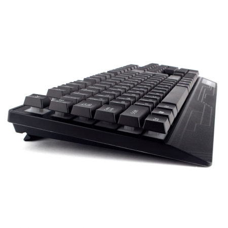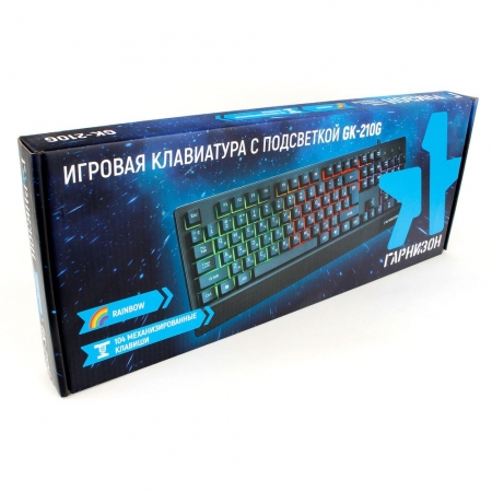 Гарнизон GK-210G - игровая клавиатура с радужной подсветкой. Модель оснащена классической раскладкой и механизированными клавишами, которые дают при нажатии тактильные ощущения механической клавиатуры. Конструкция клавиш при этом - мембранная. 19 клавиш с защитой от фантомных нажатий предотвращают случайный вылеты из игры. Клавиатура подключается к USB-порту компьютера и не требует установки драйверов.