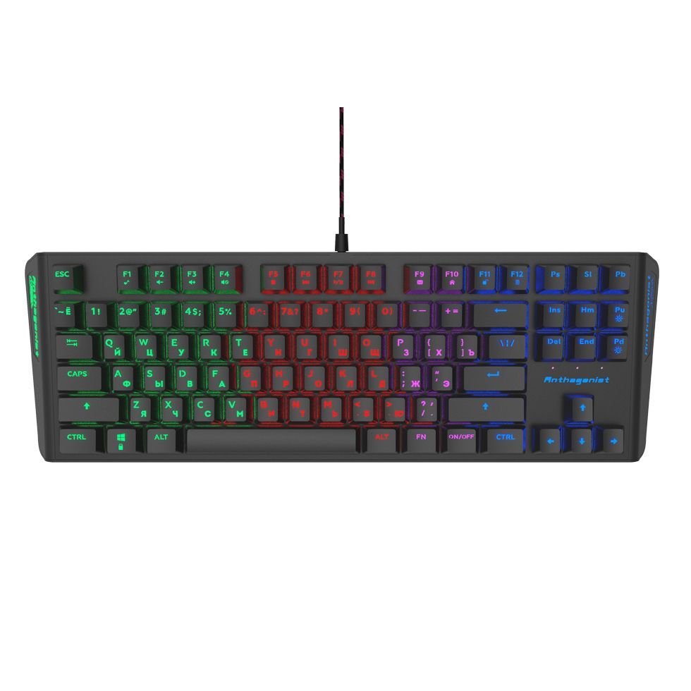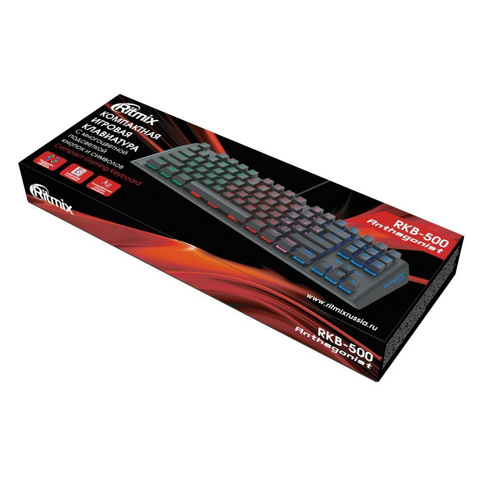 Ritmix RKB-500 Antagonist - компактная игровая клавиатура с многоцветной подсветкой. Модель обладает небольшими размерами и классической раскладкой. Она хорошо подходит для игр, не требует дополнительных драйверов, а удобное расположение клавиш исключает случайные нажатия. Функция Antighosting позволяет распознать до 19 одновременных нажатий. Также в устройстве предусмотрены мультимедийные кнопки, которые активируются клавишей Fn. Многоцветная подсветка кнопок и символов имеет регулировку яркости, а при необходимости её можно полностью отключить. Для изменения высоты наклона на корпусе клавиатуры предусмотрены складные ножки. Контакты мембран имеют посеребрение, что обеспечивает надежное нажатие и продолжительный срок службы. Подключение к USB делает клавиатуру совместимой с любым компьютером.