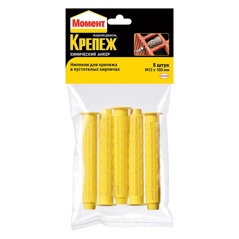 Производитель: Момент Наименование: Ниппель (жидкий дюбель) Область применения: для крепежа в пустотелых кирпичах и блоках Размер: M13 x 100 мм Упаковка: Блистер Кол-во в упаковке: 5 шт