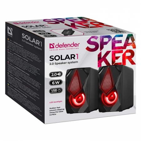 Defender Solar 1 - мультимедийная акустическая система с подсветкой. Колонки обладают суммарной мощностью 6 Вт и питаются от USB-порта. Для управления звуком имеется регулятор громкости, расположенный на кабеле. К источнику звука акустика подключается с помощью стандартного 3.5 мм аудиоразъема.
