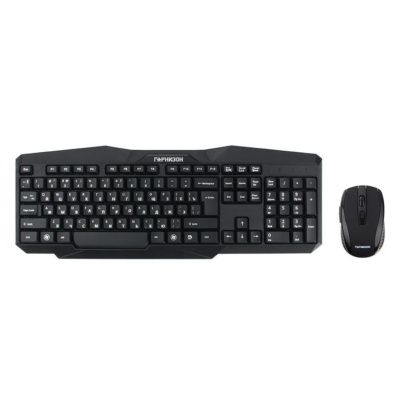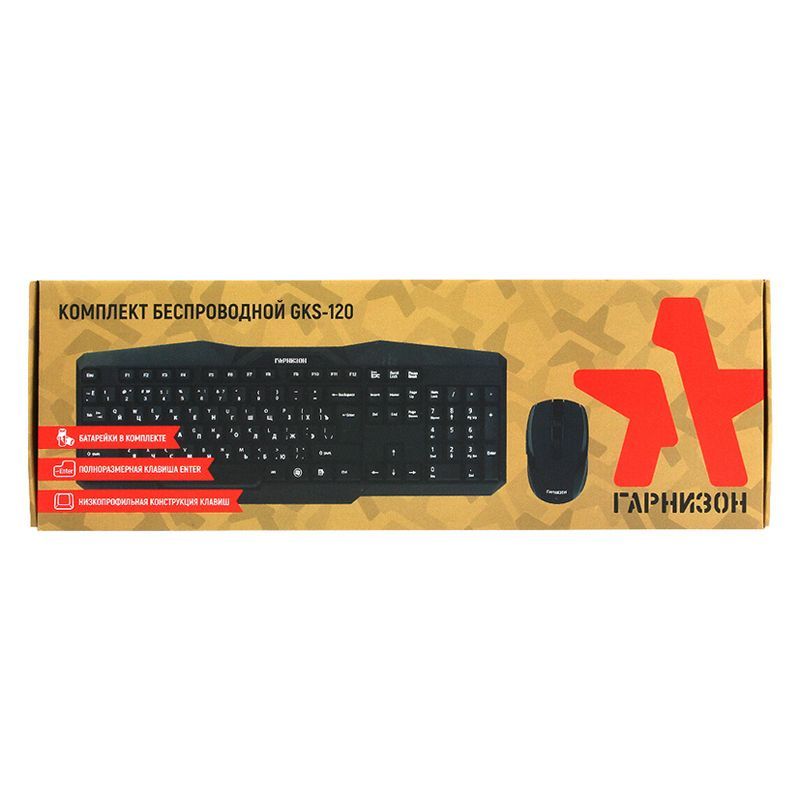 Гарнизон GKS-120 - беспроводной комплект, состоящий из полноразмерной клавиатуры и оптической мыши. Клавиатура имеет классическую раскладку, низкопрофильные клавиши и большую кнопку Enter. Мышь выполнена в эргономичном дизайне и оснащена сенсором со сменным разрешением 800/1000/1200 dpi. Помимо основных кнопок, в мышке предусмотрены две боковые, которые служат для быстрой навигации вперед/назад. Питается комплект от батареек размера АА и ААА. Передача сигнала осуществляется от одного USB-приемника на расстоянии до 10 метров.