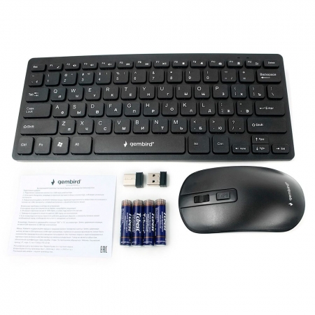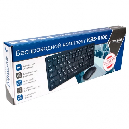 Gembird KBS-9100 - беспроводной набор, состоящий из мини-клавиатуры и мыши со сменным разрешением. Компактная клавиатура в ультратонком корпусе не займет много места и позволит расположиться на максимально удобном расстоянии от компьютера. Низкопрофильная конструкция клавиш обеспечивает быструю и комфортную печать. 14 "горячих" клавиш, активируемых кнопкой Fn, служат для быстрого доступа к функция медиаплеера и интернет-приложениям. Эргономичная мышь симметричной формы удобно ложится в ладонь и подходит для управления любой рукой. С помощью отдельной кнопки можно быстро изменить разрешение сенсора в диапазоне 1000 -1600 dpi. Набором можно пользоваться на расстоянии до 10 метров от источника беспроводного соединения. Технические характеристики