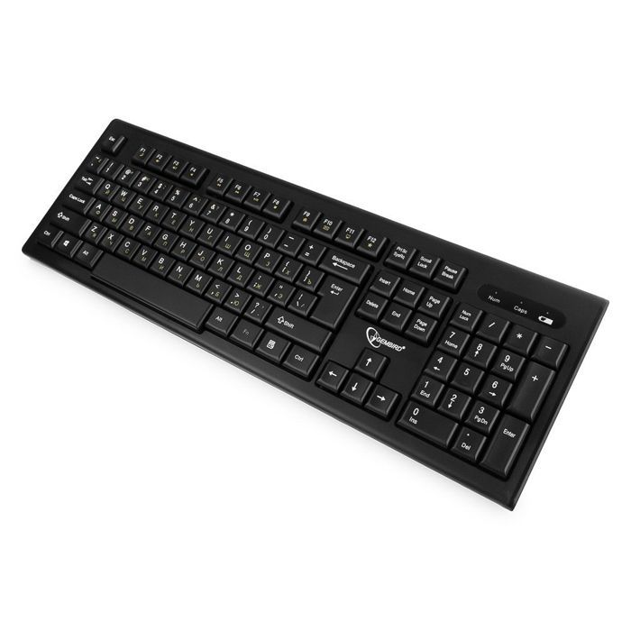Gembird KBS-8002 - беспроводной мультимедийный комплект, состоящий из клавиатуры и мыши. Клавиатура имеет полноразмерную раскладку с низкопрофильными клавишами, которые отличаются приятным и бесшумных ходом. Дополнительные кнопки, активируемые клавишей Fn, обеспечивают быстрый доступ к интернет приложениями и функциям мультимедиа. Эргономичная мышь выполнена в симметричном корпусе, подходящем для управления любой рукой. Оптический сенсор с разрешением 1000 dpi обеспечивает точное позиционирование курсора на различных поверхностях. Комплект работает от одного миниатюрного USB-приемника на расстоянии до 10 метров от компьютера. Питание мыши и клавиатуры осуществляется от батареек размеров АА и ААА.