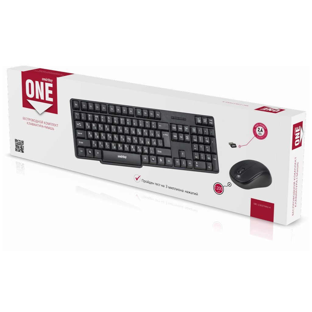 SmartBuy SBC-236374AG-K - беспроводной комплект, состоящий из клавиатуры и оптической мыши. Клавиатура имеет классическую раскладку и удобные полноразмерные клавиши Enter, Shift и Backspace. Мышь оснащена чувствительным оптическим сенсором, который обеспечивает точное позиционирование курсора и работает практически на любой поверхности. Симметричная форма мыши подходит для управления любой рукой. Для питания мыши используются две батарейки AAA, а для клавиатуры одна батарейка AA. Автоматический режим ожидания мыши и клавиатуры позволяет сэкономить заряд батарей. Оба устройства работают от одного USB-приемника на расстоянии до 10 метров от компьютера. Комплект легко подключается и не требует установки драйверов.