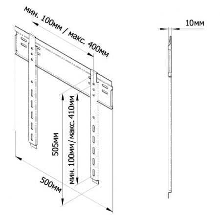 * Расстояние от стены до посадочной площадки - 10 мм * Посадочные размеры: 100 х 400 мм (ширина), 100 х 410 мм (высота) * Максимально допустимый размер диагонали дисплея - 140 см