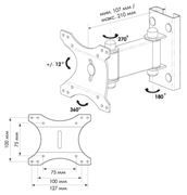 Кронштейн наклонно-поворотный Trone ЖК-75 для крепления к стене LCD, LED, ЖК-телевизора или монитора 15"- 23" (38-58.4 см). Позволяет оптимально разместить технику, сэкономив полезную площадь помещения. Поворотно-наклонный механизм с частичным складыванием позволяет осуществлять наклон на 12° и поворот на 180° (вокруг вертикальной оси). Максимальная нагрузка 25 кг. Комплект поставки включает в себя необходимую фурнитуру и инструкцию.