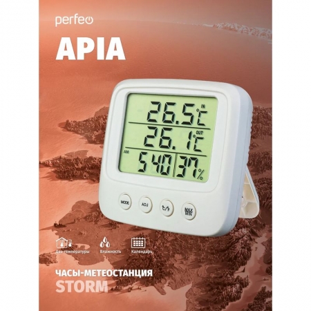 Компактная метеостанция Perfeo «Apia» позволяет измерять температуру и влажность внутри помещения, а также температуру на улице. Среди настроек есть календарь, будильник. Устройство имеет несложное кнопочное управление и низкое энергопотребление (двух батареек ААА хватит на несколько месяцев). И дома, и в офисе метеостанция «Apia» будет полезна и не займёт много места на столе, на любой полочке или на стене (имеет складную подставку и подвес на обратной стороне корпуса).