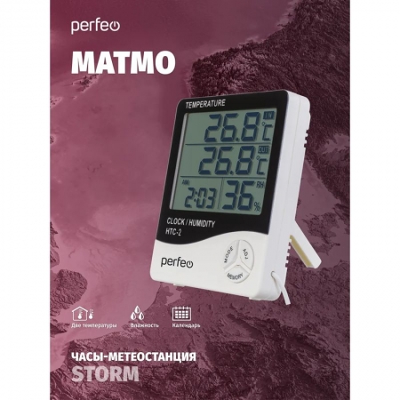 Компактная метеостанция Perfeo «Matmo» позволяет измерять температуру и влажность внутри помещения, а также температуру на улице. Среди настроек есть календарь, будильник. Устройство имеет несложное кнопочное управление и низкое энергопотребление (одной свежей батарейки ААА хватит на несколько месяцев). И дома, и в офисе метеостанция «Matmo» будет полезна и не займёт много места на столе, на любой полочке или на стене (имеет складную подставку и подвес на обратной стороне корпуса).