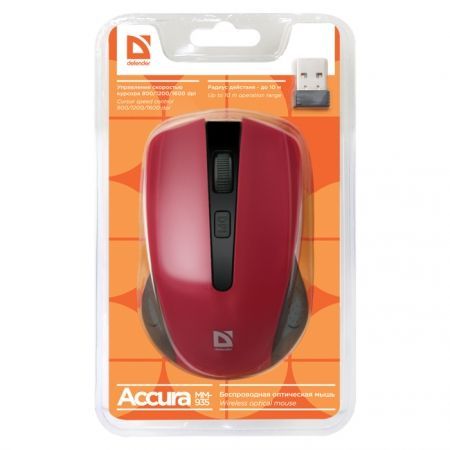 Производитель: Defender Наименование: Беспроводная мышь Управление: 2 кнопки + кнопка-колесо, кнопка смены разрешения Тип сенсора: Оптический Разрешение: 800/1200/1600 dpi Частота: 2.4 ГГц Радиус действия: до 10 м Совместимость с ОС: Windows 2000/XP/Vista/7/8, Mac OS X10 Интерфейс: USB Питание: От 2 батареек ААА Срок службы батареек: 3 - 6 мес Материал корпуса: Пластик с прорезиненным покрытием Soft touch Цвет: Красный Размеры: 5.6 x 3.3 x 10 см Вес с упаковкой: 110 г