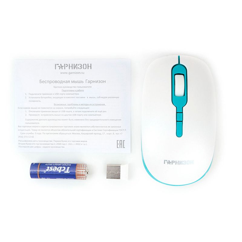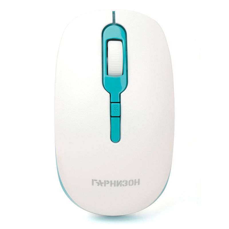 Производитель: Гарнизон Наименование: Беспроводная мышь Управление: 4 кнопки, включая кнопку-колесо и кнопку смены разрешения Тип сенсора: Оптический, чип Х4 Разрешение: 1000 -1600 dpi Радиочастота: 2.4 ГГц Радиус действия: До 10 м Интерфейс: USB Особенности: Сменное разрешение, трёхуровневая система энергосбережения Питание: 1 батарейка АА Материал корпуса: Пластик Цвет: Белый/бирюзовый Размеры: 103 х 60 х 31.5 мм Вес: 64 г