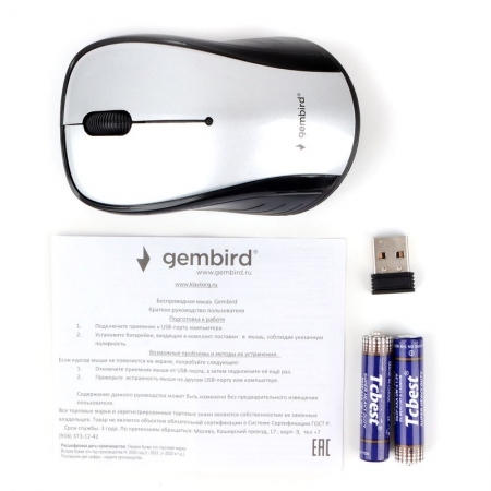 Производитель: Gembird Наименование: Беспроводная мышь Управление: 3 кнопки, включая кнопку-колесо Тип сенсора: Оптический Разрешение: 1000 dpi Частота: 2.4 ГГц Радиус действия: До 10 м Питание: От 2 батареек ААА Интерфейс: USB Материал корпуса: Пластик Цвет: Серый/чёрный Размеры: 100 х 59 х 32.5 мм Вес: 64 г Комплектация