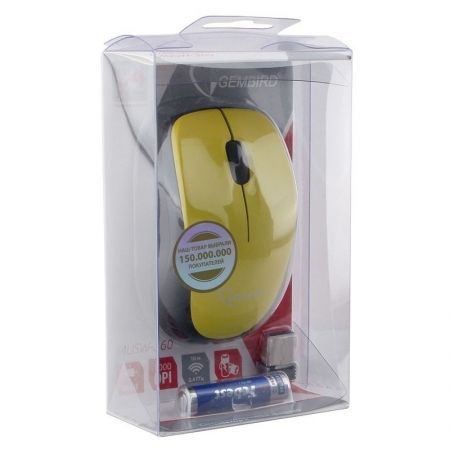 Производитель: Gembird Наименование: Беспроводная мышь Управление: 2 кнопки + кнопка-колесо Тип сенсора: Оптический X4 Разрешение сенсора: 1000 dpi Частота: 2.4 ГГц Радиус действия: До 10 м Интерфейс: USB Питание: От 1 батарейки АА Материал корпуса: Пластик Цвет: Желтый Размеры: 88 х 55 х 30 мм Вес: 60 г