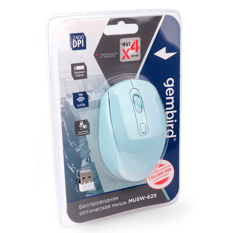 Gembird MUSW-625 - беспроводная оптическая мышь со сменным разрешением. Модель выполнена в эргономичном корпусе и имеет симметричную форму. Высокоточный оптический сенсор X4 со сменным разрешением 1000/1600/2400 dpi подходит для работы в любых приложениях. Беспроводная частота 2.4 ГГц обеспечивает уверенную работу манипулятора в радиусе до 10 метров от компьютера. В качестве источника питания используются одна батарейка размера АА. Предусмотренная треухровневая система экономии энергии позволяет продлить срок службы элементов питания. Миниатюрный USB-приемник можно оставлять подключенным к компьютеру во время транспортировки или хранить в специальном отсеке в корпусе мыши.