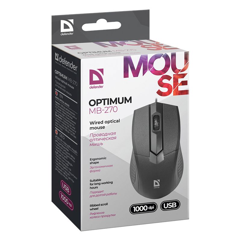 Defender Optimum MB-270 - проводная оптическая мышь для дома и офиса. Благодаря эргономичной форме, мышь удобно распологается в руке и подходит для долгой работы. Разрешение сенсора 1000 dpi является оптимальным для работы с мониторами от 9 до 22". Рифленое колесо прокрутки обеспечивает удобный просмотр интернет страниц и больших документов. Мышь подключается к USB-порту компьютера и не требует установки драйверов.