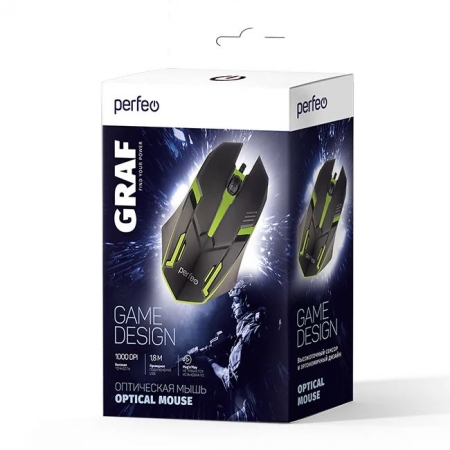 Perfeo GRAF - игровая проводная мышь с динамичной подсветкой. Мышь выполнена в эргономичном корпусе, который подходит для управления любой рукой. Оптический сенсор с разрешением 1000 dpi обеспечивает точное позиционирование курсора. Манипулятор подключается к USB-порту компьютера и не требует установки драйверов.