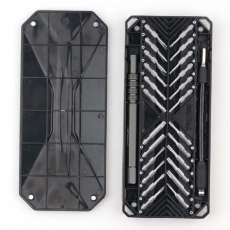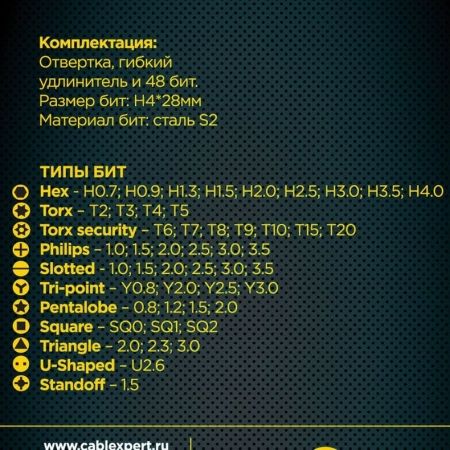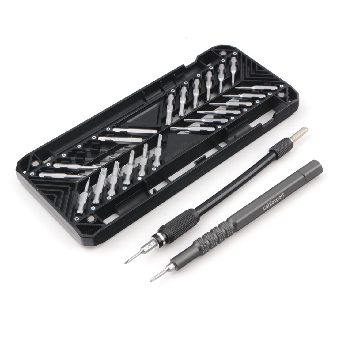 Cablexpert TK-SD-11R - набор из отвертки с магнитным держателем, гибкого удлинителя и 48 бит. Биты выполнены из легированной стали S2. Эргономичная рукоятка отвёртки имеет нескользящее покрытие и вращающуюся верхушку держателя, которая обеспечивает комфорт работы даже с "закисшими" винтами. Для удобного хранения и транспортировки набор укомплектован пластиковым кейсом.