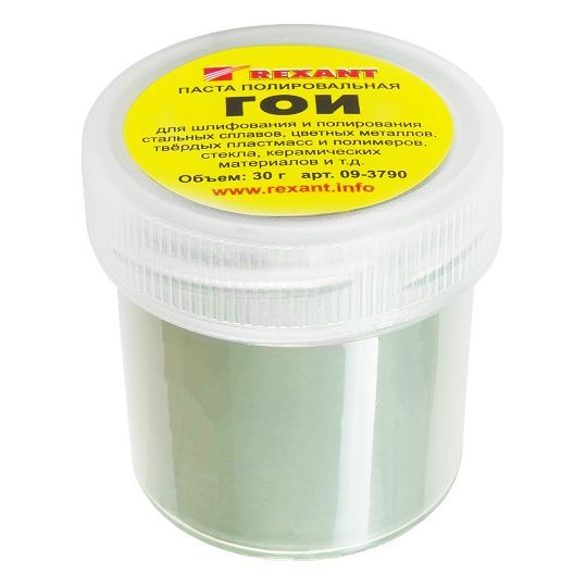 Паста полировальная ГОИ Rexant предназначена для шлифования и полирования стальных сплавов, цветных металлов, твёрдых пластмасс и полимеров, стекла (в том числе оптического), керамических материалов и изделий из них, тем самым устраняя мелкие царапины и добиваясь ровного блеска полируемой поверхности. Паста ГОИ (аббрев.учреждения в котором была разработана - Государственный Оптический Институт) состоит из оксида хрома (придаёт зелёный цвет) в виде абразивного порошка, жировых органических связующих, а также вспомогательных веществ, которые делают добавки более активными и интенсивными. Представляет собой брусок зелёного цвета (непохожего на пасту), который наносят либо, прикладывая брусок к вращающемуся полировальному кругу, либо, если вы полируете вручную, натирают ею полировальную ткань.