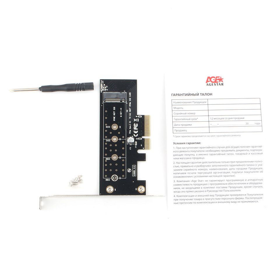 Адаптер AgeStar AS-MC01 используется для подключения M.2 NVMе SSD в ПК. Устанавливается в свободный слот PCI Express 3.0 (X4 X8 X16). Поддерживает NGFF (M.2) M key NVMe SSD, тип 2230/2242/2260/2280. Обеспечивает высокую скорость передачи данных. Совместим с ОС Windows 7/8/10, Mac OS 10.8 и выше.