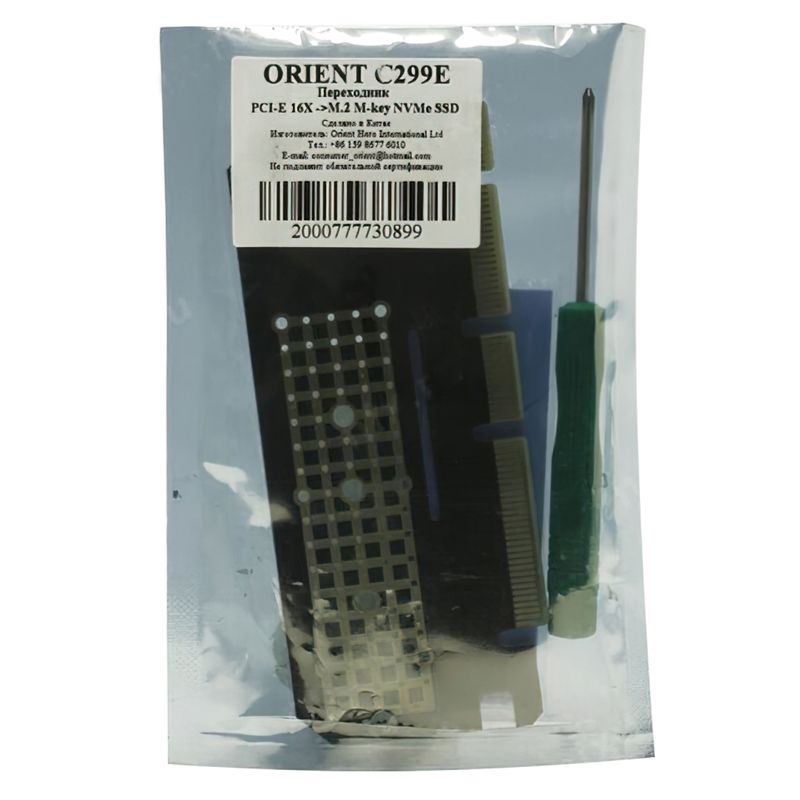 Адаптер ORIENT C299E используется для подключения M.2 NVMе SSD в ПК. Устанавливается в свободный слот PCI Express 3.0 16x. Обеспечивает скорость передачи до 32 Гбит/с (на PCI-E 3.0), до 16 Гбит/с (на PCI-E 2.0). Поддерживает NGFF (M.2) M key NVMe SSD, тип 2230/2242/2260/2280. Питается от шины PCI-E. Адаптер комплектуется тремя термопрокладками разной толщины для улучшения теплоотвода, которые устанавливаются между SSD и платой.