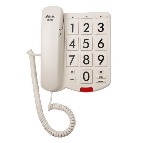 Ritmix RT-520 - проводной телефон с большими кнопками, который идеально подойдет для слабовидящих людей. Световой индикатор звонка и регулировка его громкости помогут не пропустить вызов, а регулировка громкости в трубке будет полезна для тех, кто испытывает трудности со слухом. Три экстренных номера однокнопочного набора без труда сохраняются в память телефона. Телефонный аппарат можно расположить на столе или прикрепить на стену с помощью специальных отверстий, расположенных на задней стенке корпуса.