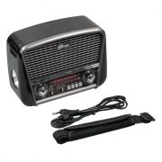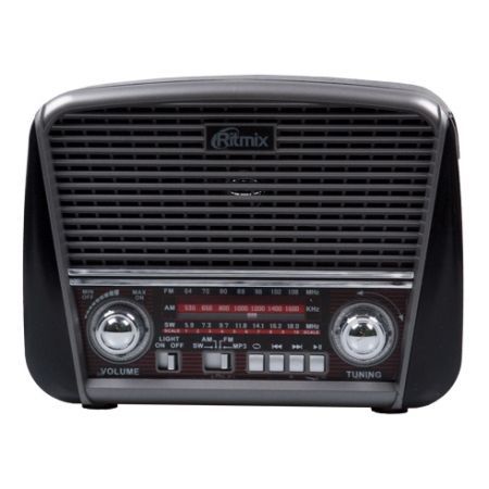 Ritmix RPR 065 - портативный трёхдиапазонный радиоприемник со встроенным фонарем и МР3 плеером. Приемник выполнен в ретростиле и работает в диапазонах MW, SW и FM. Устройство оснащено удобными регуляторами настройки радиочастоты и громкости, а также кнопочной панелью управления. Для уверенного приема в диапазоне FM предусмотрена телескопическая антенна. МР3 плеер поддерживает воспроизведение аудиоконтента с карт памяти SD, microSD и USB флэш-накопителей. С помощью AUX входа можно подключить внешний источник звука. Яркий фонарь, расположенный на боковой панели приемника, послужит источником света, когда это необходимо. Универсальное питание от электросети 220 В, встроенного аккумулятора или 2 батареек типа D, а также удобный наплечный ремень позволяют использовать радиоприемник не только дома, но и на природе.