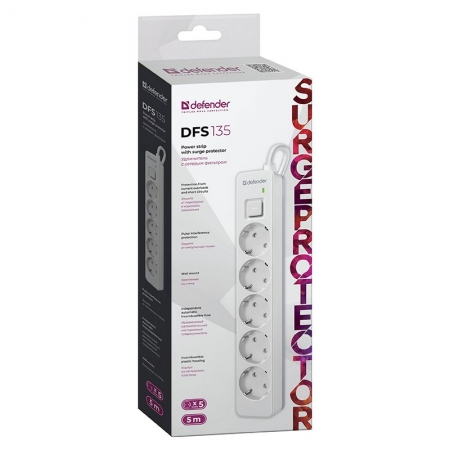 Сетевой фильтр Defender DFS 135 - удобный способ организации питания и защиты подключаемого оборудования. Модель оснащена пятью евророзетками с защитными шторками и заземляющими контактами, автоматическим предохранителем и выключателем со световой индикацией. Фильтр обеспечивает защиту от короткого замыкания, импульсных помех и превышения токовой нагрузки. Корпус сетевого фильтра выполнен из негорючего пластика и имеет отверстия для крепления на стену. Максимальная нагрузка 3.68 кВт, длина кабеля 5 метров.