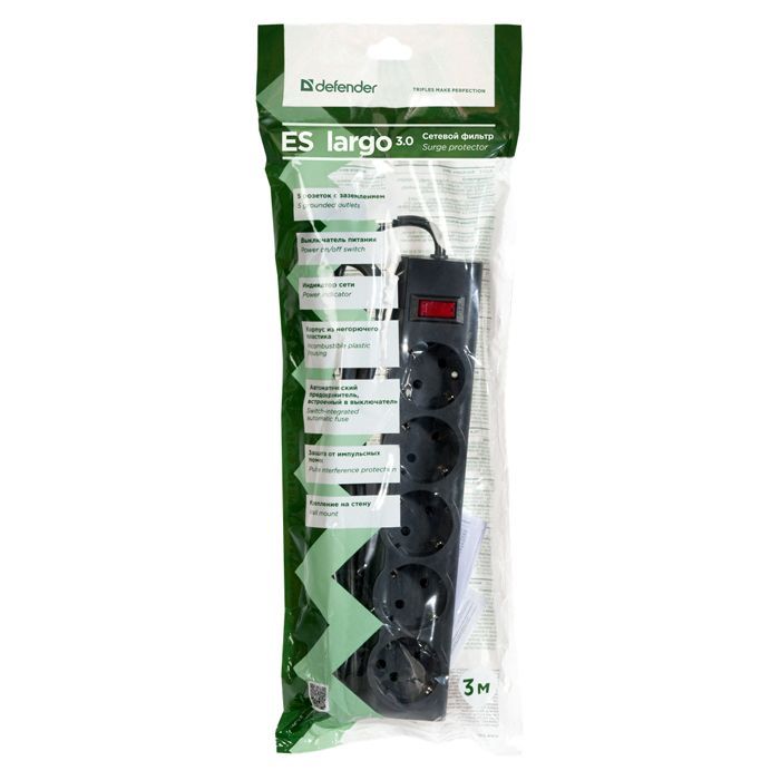 Сетевой фильтр Defender ES largo предназначен для экономичной защиты широкого спектра бытовой и электронной техники. Модель оснащена пятью розетками с заземляющими контактами и имеет автоматический предохранитель, который встроен в выключатель и служит для защиты электроприборов от перегрузки, короткого замыкания и импульсных помех. Корпус выполнен из негорючего пластика, с обратной стороны предусмотрены отверстия для крепления сетевого фильтра на стену.
