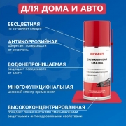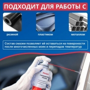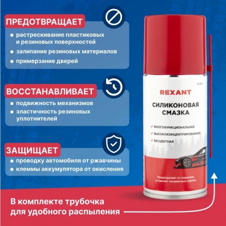 Силиконовая смазка Rexant - профессиональная концентрированная смазка для ухода за механическими соединениями в автомобиле (замки и петли дверей, капота, багажника, стеклоподъемники, тросы, личинки замков, приводы и направляющие). Незаменимое средство для обслуживания промышленного оборудования. Помогает избежать примерзания и растрескивания резиновых уплотнений дверей, багажника, капота в условиях отрицательных температур. Продлевает срок службы резиновых уплотнителей. Защищает систему зажигания от проникновения влаги и утечки тока. Защищает металлические соединения от коррозии, устраняет неприятные скрипы и прикипание деталей. Профессиональная формула смазки содержит концентрированную смесь силиконовых полимеров, которые образуют на поверхности тонкую пленку с высокими смазывающими и водоотталкивающими свойствами в широком интервале температур (от -40 до +170 °С). Смазка способна оставаться на поверхности после многочисленных моек и при частом перепаде температур. Легко наносится благодаря аэрозольному распылению, экономична при нанесении.