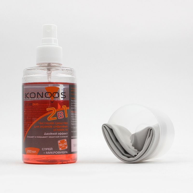 Очищающий комплекс Konoos предназначен для ухода за ЖК-экранами цифровых устройств. Обладает двойным эффектом - первый слой очищает поверхность, второй покрывает тонким слоем плёнки, который препятствует налипанию пыли. В комплект входит спрей-очиститель 200 мл и салфетка из микрофибры 18 x 18 см. Для удобства хранения и использования салфетка помещена в прозрачный колпачок от флакона.