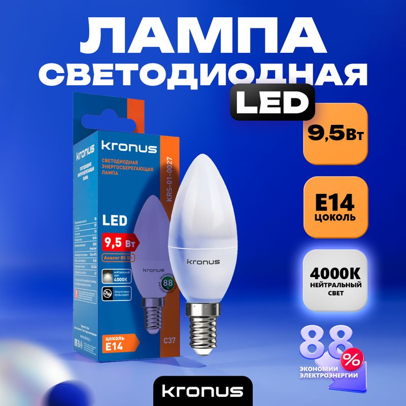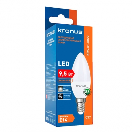 Kronus С37 - энергосберегающая светодиодная лампа общего или декоративного освещения, подходит для замены стандартных ламп накаливания и галогенных. Благодаря своей экономичности, длительному сроку службы и экологичности она выгодно отличаются от обычной лампы накаливания. Лампа С37 повторяет форму и размеры стандартных ламп типа «свеча» и идеально подходит к любому светильнику, в котором используются данные типы ламп. Колба лампы имеет матовую поверхность и оснащена цоколем E14. Хорошая цветопередача и отсутствие мерцания обеспечивают меньшую утомляемость глаз. В лампе применяется высокоэффективный драйвер с ресурсом работы до 30 000 часов. Не содержит ртути и экологически безопасна.