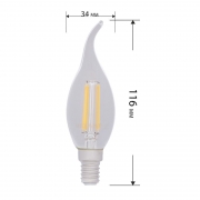 Производитель: Rexant Наименование: Энергосберегающая светодиодная лампа Эквивалент накаливания: 60 Вт Потребляемая мощность: 7.5 Вт Источник света: Filament LED Световой поток: 600 Лм Цветность: 4000 К (холодный свет) Диммируемая лампа: Нет Тип колбы: CN37 (свеча на ветру) Цоколь: Е14 Рабочее напряжение: 220 - 240В Цвет колбы: Прозрачный Размеры: 34 х 116 мм